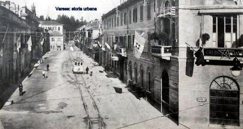 | Keywords: A sinistra Palazzo Estense (arch. Giuseppe Antonio Bianchi, 1766-73). Di fronte la casa ad angolo che ospita l'albergo Europa (1855). In fondo a Palazzo Estense la filanda costruita nel 1837 e abbattuta nel 1932 e dietro l'edificio multipiano della scuola media che venne costruito nel 1903 e abbattuto negli anni '70. Sul fondo si intravede il parco di villa Baroggi. tram varese palazzoestense | ||||