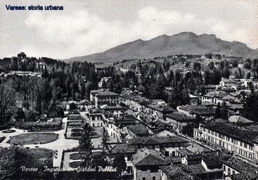 | Keywords: Vista dall'alto di via Sacco e dei Giardini Pubblici. Dopo Palazzo Estense (1766-73), all'angolo con via Verdi, è visibile l'alto palazzo multipiano delle scuole medie costruito nel 1903 e abbattuto a fine anni '70. In basso a destra casa Sacco/Ghirlanda (arch. Francesco Peverelli, 1808) sostituita nel 1964 dal palazzo della Banca d'Italia (arch. Ignazio Gardella). varese giardinipubblici palazzoestense | ||||