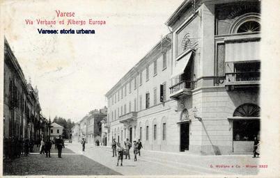 | Keywords: A sinistra Palazzo Estense (arch. Giuseppe Antonio Bianchi, 1766-73). Di fronte la casa ad angolo che ospita l'albergo Europa (1855). In fondo a Palazzo Estense la filanda costruita nel 1837 e abbattuta nel 1932. Sul fondo si intravede il parco di villa Baroggi. varese palazzoestense |