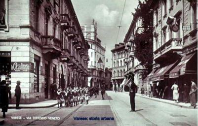 | Keywords: Via Vittorio Veneto all' incrocio con via Avegno. I balilla sfilano sotto l'occhio attento del vigile. Siamo nella prima metà degli anni '30: in corso Roma (ora Moro) palazzo Sciarini è già stato costruito ma non ancora il palazzo dell'INPS. varese viavittorioveneto |