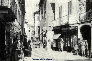 Keywords: Immagine della stretta e trafficata via Volta, sul fondo piazza Porcari (ora Monte Grappa). varese