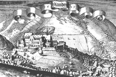 Keywords: Vianden Luxembourg Merian 1643.png en Vue upon the castle of Vianden Engraving by Mathias Merian in his work Typographia Alsatiae own Mathias Merian 1643 uploaded by Christian Ries Vianden castle Mathias Merian