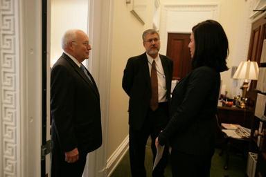 View Original:Vice_President_Cheney_Talks_with_Elyssa_Larranaga_and_David_Addington.jpg (4992x3328)
