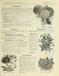 | Keywords: Vick's garden and floral guide (16562103412).jpg JAMES VICKS SONS ROCHESTER N K <br> FLOWER SEEDS 29 <br> MARIGOLD <br> The French and African Marigolds arc valuable for their flowers in autumn and can be grown <br> to advantage in little clumps with other plants in the front of shrubberies or in the garden border <br> The African varieties are the taller in growth and produce large self-colored blossoms ; the <br> French varieties are smaller some of them being elegantly striped and spotted The dwart <br> glowing kind adapt themselves to spots where the taller varieties wotdd be unsuitable Seeds <br> can be sown in a cold frame or in a seed bed in the open border and the young plants transplanted <br> late in spring where they are to remain Annuals <br> Marigold Eldorado flowers very large and double all shades of yellow and ruilled like <br> a Dahlia 10 <br> Lemon Queen large lemon colored flowers 5 <br> Prince of Orange large orange flowers 5 <br> African Marigold mixed varieties ounce 3ocents 5 <br> French Marigold striped yellow and brown 5 <br> Tall Varieties mixed ounce 30 cents 5 <br> Dwarf Varieties mixed ounce 30 cents 5 <br> Tagetes signata pumila a beautiful dwarf plant forming a globular dense mass ; fine <br> for bedding and borders 5 <br> One package 0/ each of the preceding 40 cents <br> Dwarf Marigold Little Brownie or Legion of Honor A charming single flowering <br> plant about six inches high ; very effective in masses or borders; color a brilliant gold <br> blotched with maroon 10 <br> Gold Margin New and fine 10 <br> MARIGOLD <br> LEMON QUEEN <br> GOLD MARGIN <br> LITTLE BROWNIE <br> MALOPE <br> Hnrdy plants of vigorous growth branching freely and producing large <br> flowers of brilliant crimson or of pearl white handsome as a Pelargonium <br> Malope grandiflora flowers single purple 5 <br> grandiflora alba single pure white 5 <br> MESEMBRYANTHEMUM <br> Ice Plant or Midday Flowers are pretty half-hardy annuals; delicate <br> succulent almost transparent branches and leaves Of drooping habit <br> adapted to baskets vase work and rockeries <br> Mesembryanthemum crystallinum prized for its singular icy foliage 5 <br> M1RABILIS ” Four O'Clock <br> Mirabilis is known as Four O'Clock because it opens its flower about that <br> time of the evening and fades the next morning By the French it is called <br> Belle de Xuit or Beauty of the Night It grows two feet high bright foliage <br> fragrant flowers and desirable colors Set plants two feet apart Makes a <br> nice summer hedge if set a foot apart Seed should be planted in the open <br> ground where plants are desired Opens in the afternoon The roots may be <br> taken up in the autumn and preserved through the winter for spring planting <br> in the same manner as Dahlias Annual <br> Mirabilis Marvel of Peru mixed colors ounce 20 cents 5 <br> Variegated Foliage flowers of a variety ol colors 5 <br> Long Flowered White sweet-scented ; flowers 3 to 4 inches long 5 <br> Long Flowered violet same as above except color 5 <br> Tom Thumb very dwarf covered with pure white flowers 5 <br> One package 0/ each of the above 20 cents <br> MARTYNIA <br> Robust hardy annuals about two feet high Colors y ellou <br> Martynia mixed varieties <br> white and purple <br> 5 <br> MIMULUS <br> The Mimulus or Monkey <br> Flowers named from the re- <br> semblance of the corolla to a <br> mask or face are beautiful <br> tender looking plants with <br> almost transparent branches <br> Fine for baskets vases and <br> house culture and do well <br> planted out where they will be <br> somewhat shaded Perennial <br> but bloom the first season <br> Mimulus hybridus ti- <br> grinus as beautifully <br> spotted as the Calceo- <br> larias 10 <br> hybridus tigrinus <br> g r a n d iflorus with <br> beautiful durable flow- <br> Musk Plant 5 <br> All sorts mixed 5 <br> MYOSOT1S <br> MIRABILIS OR FOUR O CLOCK <br> Perennia plant flowering first season if sown early; <br> small white and blue flowers Seed may be sown in a <br> hotbed and transplanted or in open ground in spring <br> Myosotis alpestris blue; six inches 10 <br> alpestris white; six inches 10 <br> alpestris rosea rose; six inches 10 <br> alpestris robusta grandiflora Eliza Fonro- <br> berti large flowering of pyramidal habit; <br> very fine; blue clear defined yellow edge 10 <br> palttsl vis Forget-me-not white <br> and blue 10 <br> Vick's Perfection The fincstMyosotis known <br> large bright blue flowers with twice as many <br> petals as other varieties ; plant robust nine <br> inches high 20 <br> Azorica var ccelestina flowers sky-blue ; <br> annual 15 <br> Mixed varieties 10 <br> MVOSOTIS OR FORGET-ME-NOT 43864404 149533 78224 Page 29 Text http //www biodiversitylibrary org/page/43864404 1900 10 5962/bhl title 78224 Henry G Gilbert Nursery and Seed Trade Catalog Collection ; James Vick's Sons Rochester N Y NameFound Azorica NameConfirmed Azorica NameBankID 4085978 NameFound Malope NameConfirmed Malope EOLID 2884857 NameBankID 1830422 NameFound Malope grandiflora NameConfirmed Malope grandiflora NameBankID 10707827 NameFound Martynia NameConfirmed Martynia L EOLID 61735 NameFound Mesembryanthemum NameConfirmed Mesembryanthemum EOLID 11256701 NameBankID 2665273 NameFound Mesembryanthemum crystallinum NameConfirmed Mesembryanthemum crystallinum EOLID 489525 NameBankID 2668156 NameFound Mimulus NameConfirmed Mimulus EOLID 103579 NameBankID 4774934 NameFound Mimulus hybridus NameConfirmed Mimulus hybridus NameBankID 5873841 NameFound Mirabilis NameConfirmed Mirabilis EOLID 39464 NameBankID 2646115 NameFound Myosotis alpestris NameConfirmed Myosotis alpestris EOLID 11213411 NameBankID 2771432 NameFound Pelargonium NameConfirmed Pelargonium EOLID 11158713 NameBankID 1674593 NameFound Pelargonium NameConfirmed Pelargonium EOLID 11158713 NameBankID 2652507 NameFound Tagetes signata pumila NameConfirmed Tagetes signata Bartling EOLID 503421 Biodiversity Heritage Library Vick's garden and floral g