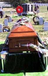 | Keywords: Victims of the Terrorist Attack on the Pentagon Memorial - casket - Arlington National Cemetery - 2002-09-12.jpg en The casket containing the remains of 25 individuals killed at the Pentagon during the 9/11 terrorist attacks awaits burial at Arlington National Cemetery in Arlington Virginia U S on September 12 2002 The funeral was for those five individuals for whom no remains could be identified after the attack The remains of 25 others the majority of whose remains had been identified and buried months earlier; additional remains had been found however were cremated interred in an urn the urn placed in a casket and the casket interred beneath the Victims of Terrorist Attack on the Pentagon Memorial The Victims of Terrorist Attack on the Pentagon Memorial black cube-like object can be seen in the rearground along with a red carnation floral display in the form of a pentagon http //osd dtic mil/news/Sep2002/200209124g_hr jpg American Forces Press Service U S Department of Defense Rudi Williams photographer 2002-09-12 PD-USGov Victims of Terrorist Attack on the Pentagon Memorial First anniversary of the September 11 2001 attacks |