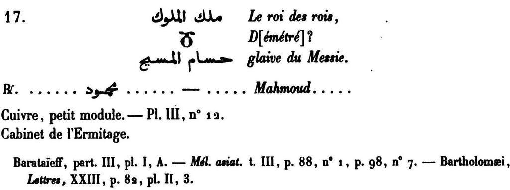 | Keywords: Victor Langlois.Demetre.Le roi des rois Demetre, glaive du Meisse. Mahmoud 52.jpg fr Victor Langlois Demetre Le roi des rois Demetre glaive du Meisse Mahmoud 52 http //books google com/books id puYWAAAAYAAJ pg RA1-PA52 v onepage q f false Victor Langlois Numismatique de la Géorgie au Moyen âge P 52 1852 Victor Langlois 1829-1869 Source http //books google com/books id puYWAAAAYAAJ Numismatique de la Géorgie au Moyen âge by Victor Langlois PD-old Numismatique de la Géorgie au Moyen âge Victor Langlois Scans from Google Books |