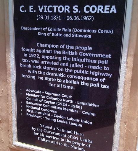 Keywords: VictorCoreaChilaw.jpeg en The plaque in the west coast town of Chilaw in Sri Lanka detailing the exploits of Victor Corea a national hero 2011-08-29 own Delboy59 cc-zero Uploaded with UploadWizard Politicians of Sri Lanka