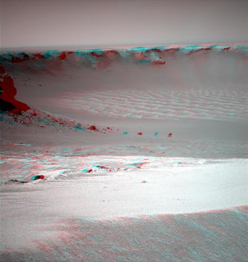 | Keywords: Victoria Crater 3D 04.png anaglyph This anaglyph was made using the Mars Rover Opportunity Navcam raw images taken at the rim of Victoria Crater on Sol 952 available at http //marsrovers jpl nasa gov http //marsrovers jpl nasa gov It was created by J Bergquist using Mathcad 11 The NASA/JPL versions of these images are at http //photojournal jpl nasa gov/jpeg/PIA08784 jpg http //photojournal jpl nasa gov and http //marsrovers jpl nasa gov/gallery/press/opportunity/20060928a/site_B76_275_navcam_CYP_A-B953R1 jpg http //marsrovers jpl nasa gov Note that there seems to have been some losses in the conversion to a panoramic anaglyph Transferred from http //en wikipedia org en wikipedia 2006-09-30 Original uploader was Jbergquist at http //en wikipedia org en wikipedia PD-RETOUCHED-USER jbergquist original upload log page en wikipedia Victoria_Crater_3D_04 png 2006-09-30 22 50 Jbergquist 962×1019×8 1441684 bytes <nowiki>This anaglyph was made using the Mars Rover Opportunity Navcam raw images taken at the rim of Victoria Crater on Sol 952 available at http //marsrovers jpl nasa gov http //marsrovers jpl nasa gov It was created by J Bergquist using Mathcad 11 The N</nowiki> Victoria crater Mars 3D landscape |