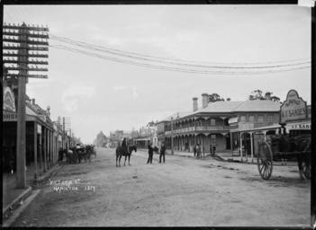 | Keywords: blackandwhite monochrome outdoor road photo border architecture black and white View of Victoria Street, Hamilton. Photograph taken by William A Price. Dated from the existence of various businesses in Victoria Street in 1908 (See Wise's Post Office Directory 1908). Business signs for R F Sandes (Chemist), Langley Shaw (stock & station agents), and the Peerless Printing Works are all visible, and centre right is the Hamilton Hotel. There are a number of people in the street, including several in carriages, and one man riding a horse. Inscriptions: Inscribed - Photographer's title on negative -bottom left: Victoria St. Hamilton. 1317. Quantity: 1 b&w original negative(s). Physical Description: Dry plate glass negative 6.5 x 4.5 inches Victoria Street, Hamilton. Price, William Archer, 1866-1948 :Collection of post card negatives. Ref: 1/2-001326-G. Alexander Turnbull Library, Wellington, New Zealand. natlib.govt.nz/records/23075839 View of Victoria Street, Hamilton. Photograph taken by William A Price. Dated from the existence of various businesses in Victoria Street in 1908 (See Wise's Post Office Directory 1908). Business signs for R F Sandes (Chemist), Langley Shaw (stock & station agents), and the Peerless Printing Works are all visible, and centre right is the Hamilton Hotel. There are a number of people in the street, including several in carriages, and one man riding a horse. Inscriptions: Inscribed - Photographer's title on negative -bottom left: Victoria St. Hamilton. 1317. Quantity: 1 b&w original negative(s). Physical Description: Dry plate glass negative 6.5 x 4.5 inches Victoria Street, Hamilton. Price, William Archer, 1866-1948 :Collection of post card negatives. Ref: 1/2-001326-G. Alexander Turnbull Library, Wellington, New Zealand. natlib.govt.nz/records/23075839 |