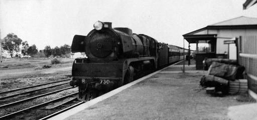 | Keywords: blackandwhite monochrome vehicle train locomotive outdoor black and white 37 42S 144 28E Parwan, 1953, is a closed station located in the town of Parwan, near Bacchus Marsh, on the Ararat railway line in Victoria, Australia. Opened 18 March 1886. Closed 1987. 37 42S 144 28E Parwan, 1953, is a closed station located in the town of Parwan, near Bacchus Marsh, on the Ararat railway line in Victoria, Australia. Opened 18 March 1886. Closed 1987. Victorian Railways R 730.jpg Photograph of Victorian Railways R class locomotive R 730 at Parwan Victoria in 1953 PD-Australia Original upload log page en wikipedia R730parwan jpg 2006-12-24 00 29 Zzrbiker 800×375× 48278 bytes <nowiki>Victorian Railways R class locomotive R 730 at Parwan Victoria 1953 PD-Australia </nowiki> 1953 in rail transport in Australia Victorian Railways R class steam locomotives Disused train stations in Victoria Australia Serviceton railway line Parwan Victoria 37 42S