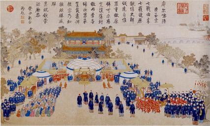 | Keywords: Victory banquet at the Ziguangge (Hall of Purple Glaze).jpg zh æ¸…ä¹¾éš†ã Šå¹³å®šå»“çˆ¾å– å¾—å‹ å –ã ‹ä¹‹ã Šå»“çˆ¾å– é™ªè‡£è‡³äº¬ã ‹ en The Victory banquet for the victorious army of the Gurkha Campaign Nepal 1791 - 1792 http //www battle-of-qurman com cn/e/hist htm late XVIII century A collaboration between Chinese and European painters The Jesuit missionaries involved in producing the drawings in China were Giuseppe Castiglione Jean-Denis Attiret Ignace Sichelbart and Jean Damascene The engravings were executed in Paris under the direction of Charles-Nicolas Cochin of the Académie Royal at the Court of Louis XVI and the individual engravers include Le Bas Aliamet Prevot Saint-Aubin Masquelier Choffard and Launay PD-Art Gurkha Campaigns 1788-1792 Paintings of the Qing Dynasty Military of Qing China |