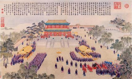 | Keywords: Victory banquet for the distinguished officers and soldiers at the Ziguangge (Hall of Purple Glaze).jpg en A banquet held at the Hall of Purple Glaze in honor of the victorious Chinese army of the Jinchuan Campaign 1771-1776 zh-hans 平定金 得 ,凯宴成功诸将士 http //www battle-of-qurman com cn/e/hist htm late XVIII century A collaboration between Chinese and European painters The Jesuit missionaries involved in producing the drawings in China were Giuseppe Castiglione Jean-Denis Attiret Ignace Sichelbart and Jean Damascene The engravings were executed in Paris under the direction of Charles-Nicolas Cochin of the Académie Royal at the Court of Louis XVI and the individual engravers include Le Bas Aliamet Prevot Saint-Aubin Masquelier Choffard and Launay PD-Art Military of Qing China Ten Great Campaigns Paintings of the Qing Dynasty Zhongnanhai West Park Beijing |