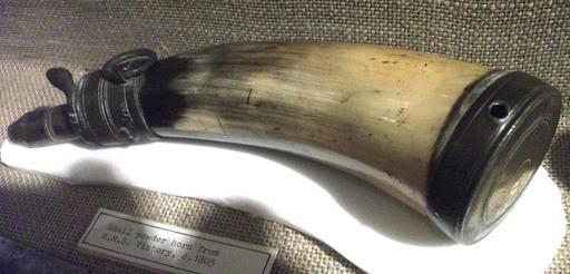 Keywords: VictoryPowderHorn.JPG en Small powder horn made around 1805 from H M S Victory on display in Bedford Museum own Simon Speed 2010-09-14 Photos by Simon Speed Bedford Museum Bedford HMS Victory ship 1765 Powder horns