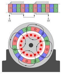 | Keywords: Vierpolig-3stränge.svg de Das Bild zeigt die Wicklung einer 4-poligen Asynchronmotor mit 3 Strängen Oben in Abwicklung und am Motor Besonders zu beachten ist das Wicklung W entgegengesetzt gepolt wird doch der Wicklungssinn den anderen Polen des Motors gleicht Die Reihenfolge der Pole ist somit nicht +U+V+W sondern +U-W+V Die Phase zur Folgewicklung beträgt somit 60° <br /> Des Weiteren sind exemplarisch die Magnetfeldlinien für die U-Wicklung eingezeichnet Hierbei erkennt man die vier magnetischen Pole die der Stator zum Rotor hin bildet In der Diagonalen von links oben nach rechts unten zwei Südpole und in der Diagonalen von rechts oben nach links unten zwei Nordpole<br /> Bei anlegen eines Drehstromes mit Rechtsdrehfeld läuft der Rotor im Uhrzeigersinn Own Created with Inkscape BurnsBurnsBurns SVG electric motors |