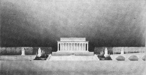 | Keywords: View of the approved 1926 plan for Arlington Memorial Bridge eastern approaches at the Lincoln Memorial.jpg en Black-and-white watercolor of the eastern approaches of the Arlington Memorial Bridge across the Potomac River in Washington D C in the United States The approaches were designed by the architectural firm of McKim Mead White The lead designer was William Mitchell Kendall The view is looking directly west at the water line of the Potomac River at the Lincoln Memorial The entrance to the Rock Creek and Potomac Parkway is to the left indicated by two square columns The Watergate flanked by plantings is in the center of the image with a low fountain shown in the plaza to be created in front of the memorial Two square columns mark the entrance to the Arlington Memorial Bridge which can be seen to the right This design was approved but budgetary civil engineering and other concerns led to its radical revision http //hdl handle net/2027/mdp 39015071561925 urlappend 3Bseq 80 Commission of Fine Arts Report of the United States Commission of Fine Arts July 1 1921 to June 30 1925 Washington D C U S Government Printing Office 1926 p 52 1926 PD-USGov Arlington Memorial Bridge Watergate Steps 1926 in Washington D C |