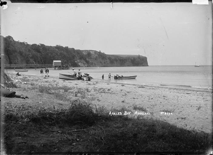 Keywords: blackandwhite monochrome outdoor photo border black and white View of the bay taken from the beachfront looking towards the jetty at the northern end of the bay and the southern side of the Whanaparaoa Peninsula. Adults are sitting on a boat on the foreshore and children are playing near a boat at the water's edge. A woman is lying on the grass on the beachfront in the immediate foreground on the left (partially obscured). Taken by William A Price in early 1900s. Inscriptions: Inscribed - Photographer's title on negative -bottom centre: Arkle's Bay. Auckland. No 857A.. William Archer Price lived and practised in Queen Street, Northcote, 1909-1910. Source: New Zealand Post Office directories Quantity: 1 b&w original negative(s). Physical Description: Dry plate glass negative 4.5 x 6.5 inches View of Arkles Bay, Auckland. Price, William Archer, 1866-1948 :Collection of post card negatives. Ref: 1/2-001400-G. Alexander Turnbull Library, Wellington, New Zealand. natlib.govt.nz/records/22740153 View of the bay taken from the beachfront looking towards the jetty at the northern end of the bay and the southern side of the Whanaparaoa Peninsula. Adults are sitting on a boat on the foreshore and children are playing near a boat at the water's edge. A woman is lying on the grass on the beachfront in the immediate foreground on the left (partially obscured). Taken by William A Price in early 1900s. Inscriptions: Inscribed - Photographer's title on negative -bottom centre: Arkle's Bay. Auckland. No 857A.. William Archer Price lived and practised in Queen Street, Northcote, 1909-1910. Source: New Zealand Post Office directories Quantity: 1 b&w original negative(s). Physical Description: Dry plate glass negative 4.5 x 6.5 inches View of Arkles Bay, Auckland. Price, William Archer, 1866-1948 :Collection of post card negatives. Ref: 1/2-001400-G. Alexander Turnbull Library, Wellington, New Zealand. natlib.govt.nz/records/22740153 |