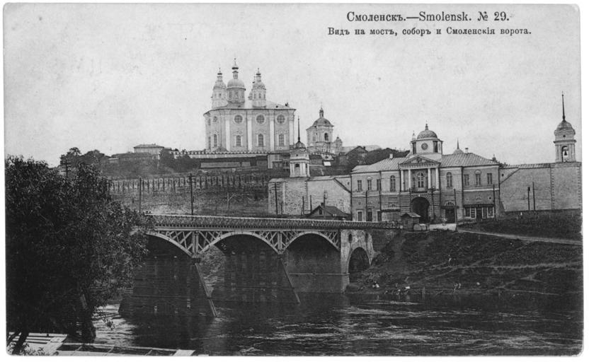 Keywords: View of the bridge over the Dnieper, the Dnieper gate and Assumption Cathedral.jpg en View of the bridge over the Dnieper now destroyed the ruins Dnieper gate with a fragment of the Smolensk fortress wall and Cathedral of the Assumption ru Вид на мост че ез Днеп ныне уничтожен сох анились уины Днеп овские во ота с ф агментом Смоленской к епостной стены и Успенский Собо О игинальная отк ытка е установлены before 1917 года PD-RusEmpire 20th-century postcards of Russia Postcards of Smolensk Dnieper River in Smolensk