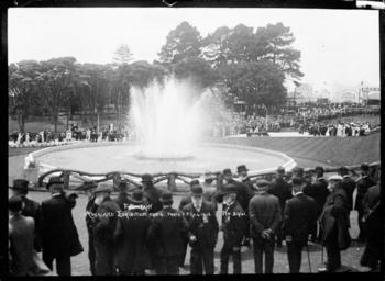 | Keywords: blackandwhite monochrome outdoor crowd people black and white View of the Fairy Fountain playing during the opening ceremony. Men are standing in the immediate foreground and a large crowd is gathered on the far side. In the distance on the right can be seen the entrance to Wonderland and Hazard's Rifle Range. Photograph taken by William Archer Price, 4 Dec 1914 at the Auckland Exhibition, Auckland Domain. Inscriptions: Inscribed - Photographer's title on negative -bottom centre: Fountain. Auckland Exhibition 1913-4. Protd. P.P.Co. 4.12.13. No 2961.. Quantity: 1 b&w original negative(s). Physical Description: Dry plate glass negative 4.5 x 6.5 inches View of the Fairy Fountain playing at the opening of the Auckland Exhibition, Auckland Domain. Price, William Archer, 1866-1948 :Collection of post card negatives. Ref: 1/2-001146-G. Alexander Turnbull Library, Wellington, New Zealand. natlib.govt.nz/records/23229989 View of the Fairy Fountain playing during the opening ceremony. Men are standing in the immediate foreground and a large crowd is gathered on the far side. In the distance on the right can be seen the entrance to Wonderland and Hazard's Rifle Range. Photograph taken by William Archer Price, 4 Dec 1914 at the Auckland Exhibition, Auckland Domain. Inscriptions: Inscribed - Photographer's title on negative -bottom centre: Fountain. Auckland Exhibition 1913-4. Protd. P.P.Co. 4.12.13. No 2961.. Quantity: 1 b&w original negative(s). Physical Description: Dry plate glass negative 4.5 x 6.5 inches View of the Fairy Fountain playing at the opening of the Auckland Exhibition, Auckland Domain. Price, William Archer, 1866-1948 :Collection of post card negatives. Ref: 1/2-001146-G. Alexander Turnbull Library, Wellington, New Zealand. natlib.govt.nz/records/23229989 |