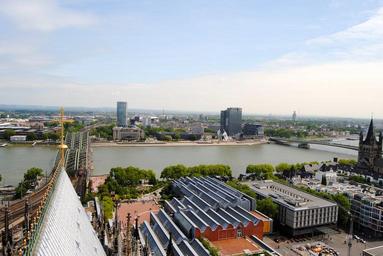 Keywords: view from dom cologne rheinbrücke triangle tower rhine roofs places of interest port harbour area rhine river building kölner building historically architectural style gothic style gothic architecture