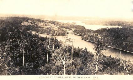 Keywords: forestry tower forestrytower fire tower firetower myer's cave myerscave myer cave myercave forestry view forest fire forestfire cloyne marble lake marblelake mississagagon lake mississagagonlake kashwakamak lake kashwakamaklake gull lake gulllake outdoor landscape John Bolton researched the forestry towers in the Cloyne and area and submitted an article for print in the November 2007, Fall edition Pioneer Times Newsletter . The Newsletter is can be viewed online at www.cloynepioneermuseum.ca Newsletter. There is also a photo (circa 1955) of the tower in the article. This is an excerpt from John's article: 'Myer’s Cave Tower is(was) located on what is known as Tower Road just east of Myer’s Cave on North Frontenac Road 506. This tower was an important one in the system, overlooking Marble, Mississagagon, Kashwakamak and Gull Lakes with many resorts and camps in the area. Ezra Wheeler, Harvey Spencer, Jim Perry and Oscar Lemke manned this tower over the years. Jim was probably the best known; he would welcome guests to come up to admire the view and explain the working of the system. After a long day, Jim would walk to Myer’s Cave and stay overnight with his brother George and sister-in-law Beatrice Perry. In the morning, he would go to Myer’s Cave Lodge, start the kitchen wood stove for cooking the breakfast for the many tourists. Ellery Thompson of Kaladar Northern Telephone told me that the phone batteries had to be changed at this tower on a regular basis. If the fire watch was slow, Jim would call friends and visit so the batteries would run down quickly.' John Bolton researched the forestry towers in the Cloyne and area and submitted an article for print in the November 2007, Fall edition Pioneer Times Newsletter . The Newsletter is can be viewed online at www.cloynepioneermuseum.ca Newsletter. There is also a photo (circa 1955) of the tower in the article. This is an excerpt from John's article: 'Myer’s Cave Tower is(was) located on what is known as Tower Road just east of Myer’s Cave on North Frontenac Road 506. This tower was an important one in the system, overlooking Marble, Mississagagon, Kashwakamak and Gull Lakes with many resorts and camps in the area. Ezra Wheeler, Harvey Spencer, Jim Perry and Oscar Lemke manned this tower over the years. Jim was probably the best known; he would welcome guests to come up to admire the view and explain the working of the system. After a long day, Jim would walk to Myer’s Cave and stay overnight with his brother George and sister-in-law Beatrice Perry. In the morning, he would go to Myer’s Cave Lodge, start the kitchen wood stove for cooking the breakfast for the many tourists. Ellery Thompson of Kaladar Northern Telephone told me that the phone batteries had to be changed at this tower on a regular basis. If the fire watch was slow, Jim would call friends and visit so the batteries would run down quickly.'