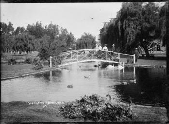 | Keywords: wikipedia:en=whanganui geo:town=whanganui geo:country=new zealand geo:country=newzealand photographer:name=william archer price photographer:name=williamarcherprice blackandwhite monochrome outdoor water watercourse photo border black and white View of three people on an arched footbridge, with swans and ducks on a small lake at the Wanganui Racecourse. Photograph taken by William Archer Price. Inscriptions: Inscribed - Photographer's title on negative -bottom left: Wanganui Racecourse. [No.] 167. Quantity: 1 b&w original negative(s). Physical Description: Dry plate glass negative View of the gardens behind the Wanganui Racecourse, with swans on a lake. Price, William Archer, 1866-1948 :Collection of post card negatives. Ref: 1/2-001615-G. Alexander Turnbull Library, Wellington, New Zealand. natlib.govt.nz/records/22799330 View of three people on an arched footbridge, with swans and ducks on a small lake at the Wanganui Racecourse. Photograph taken by William Archer Price. Inscriptions: Inscribed - Photographer's title on negative -bottom left: Wanganui Racecourse. [No.] 167. Quantity: 1 b&w original negative(s). Physical Description: Dry plate glass negative View of the gardens behind the Wanganui Racecourse, with swans on a lake. Price, William Archer, 1866-1948 :Collection of post card negatives. Ref: 1/2-001615-G. Alexander Turnbull Library, Wellington, New Zealand. natlib.govt.nz/records/22799330 |