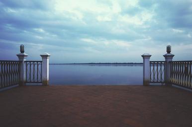 Keywords: view lake clouds water fence gate posts calm tranquil dark scene