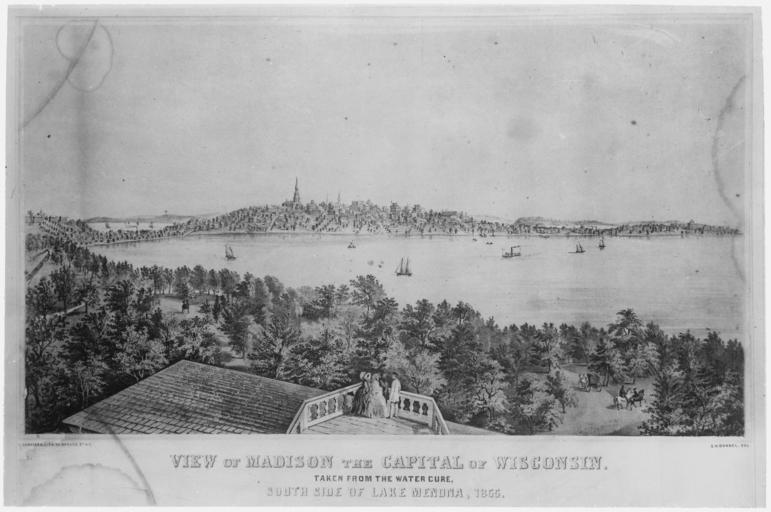 | Keywords: "View of Madison, the Capital of Wisconsin. Taken from the Water Cure, South Side of Lake Menona, 1855.".jpg Scope and content C Curriers New York General notes Lithograph 535911 Local identifier 208-PR-10E-14 Office for Emergency Management Office of War Information Overseas Operations Branch New York Office News and Features Bureau 12/17/1942 - 09/15/1945 NARA-Place United States North and Central America nation 4199172 38 -98 <br /> Still Picture Records Section Special Media Archives Services Division NWCS-S National Archives at College Park 8601 Adelphi Road College Park MD 20740-6001 1855 Record group Record Group 208 Records of the Office of War Information 1926 - 1951 Record group ARC 535 Photographs Used in Publications compiled 1943 - 1945 Series ARC 535898 File unit File unit ARC Variant control numbers NAIL Control Number NWDNS-208-PR-10E-14<br /> Select List Identifier AMCITY 12 Other versions <gallery> File View_of_Madison _the_Capital_of_Wisconsin _Taken_from_the_Water_Cure _South_Side_of_Lake_Menona _1855 tif tif File View_of_Madison _the_Capital_of_Wisconsin _Taken_from_the_Water_Cure _South_Side_of_Lake_Menona _1855 jpg jpg </gallery> NARA-cooperation PD-USGov Lake Monona Lithographs of the United States 1855 lithographs FSA-OWI Wisconsin in the 1850s |