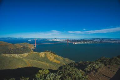 Keywords: view panorama bay area golden gate bridge san francisco usa amreica tourism destination famous water sea ocean hills landscape red steel travel city scene vacation mountain far clear
