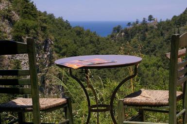 Keywords: view panorama landscape sky mountain landscape mountains nature trees summer water sea greece greek island samos greek tourism table chair tavern holiday mood atmosphere