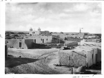 Photograph of a view of the Pueblo of Isleta, New Mexico, ca.1898. Several cube-shaped adobe buildings and walls line the curving dirt road in the foreground. A church topped with two corner towers and three crosses is visible in the background. A dome sits near a squat building towards the right foreground, while a windmill in the distance at right towers above the pueblo.