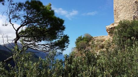 Keywords: view to the sea landscape mallorca nature blue water water sea booked tree rock sun grass karg clouds tower scrub dry spain