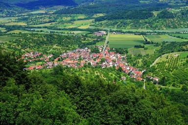 Keywords: viewpoint mörike rock rand ecker maar swabian alb idyll hepsisau albdorf village aerial view fields reported forests agriculture idyllic