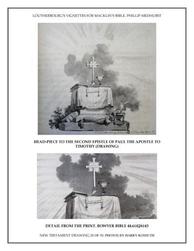 | Keywords: Vignette by Loutherbourg for the Macklin Bible 112 of 134. Bowyer Bible New Testament. Headpiece to 2 Timothy.gif en Head-piece to the second epistle of Paul the apostle to Timothy vignette with an altar and incense burner 2 Timothy 3 5 ; letterpress in two columns below and on verso 1800 Inscriptions Lettered below image with production detail P J de Loutherbourg del J Heath direx and publication line Pubd by T Macklin Fleet Street London Print made by James Heath Dimensions height 490 millimetres sheet ; width 390 millimetres sheet Photos by Harry Kossuth Phillip Medhurst 1800-01-01 PD-old-100 Second Epistle to Timothy Vignettes by Loutherbourg for the Macklin Bible Vignette Drawings by Loutherbourg in the Bowyer Bible Art depicting the New Testament by Philippe De Loutherbourg |