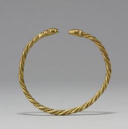 | Keywords: Viking - Arm Ring - Walters 57466.jpg Together with its mate Walters 57 467 this bracelet has stylized animal-head terminals much like those found on jewelry made by Germanic peoples to the south Arm rings or armlets made by twisting thick and thin rods of gold or silver were common during the Viking period when wealth was literally worn on one's sleeves Arm rings the portable savings accounts of the Vikings would be collected exchanged or hacked up to provide weighed amounts of gold to purchase goods century 9 11 Medieval gold cm 7 8 8 1 0 8 accession number 57 466 28073 Joseph Brummer Henry Walters Baltimore February 8 1927 by purchase Walters Art Museum 1931 by bequest Acquired by Henry Walters 1927 Early Christian and Byzantine Art Baltimore Museum of Art Baltimore 1947 place of origin southwest Russia Walters Art Museum license Medieval metalwork in the Walters Art Museum Jewellery in the Walters Art Museum Viking jewellery Media contributed by the Walters Art Museum needs category review Armlets |