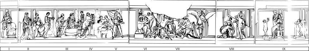 | Keywords: Villa dei Misteri - Sala del Grande Dipinto - Scene Sequence.svg Le religioni misteriche nell'antichità greco-romana erano delle sette religiose che promettevano ai loro aderenti di interrompere prima del tempo il ciclo di reincarnazioni in nuovi corpi al quale tutti gli esseri umani erano condannati nelle loro vite terrene al fine di liberarsi dall'elemento titanico materiale e malvagio di cui sono formati e di ritornare prima della fine del ciclo universale di 12 000 anni fra gli dei dei quali essi fanno parte grazie all'altro elemento che li compone quello divino la parte spirituale e buona dell'essere umano Sulle pareti del triclinio della Villa dei Misteri a Pompei è rappresentato caso unico in tutto il mondo antico il rito di iniziazione di una giovane donna ai misteri orfico-dionisiaci rito che - dopo un lungo periodo di formazione - le permetteva di entrare a pieno titolo a far parte della comunità e soprattutto dopo la sua morte di essere accolta nell'Olimpo fra gli altri dei anziché di tornare nell'Ade fra le anime dei comuni mortali che presso il fiume infernale Lete dovevano attendere mille anni prima di reincarnarsi in un nuovo corpo e ritornare a vivere sulla Terra Nel ciclo pittorico affrescato si riconoscono in nove quadri i sette momenti principali del rito di iniziazione 1 IX la VESTIZIONE dell'inizianda per le nozze mistiche col dio; 2 II la CATECHESI o lettura del rituale; 3 III l'AGAPE fraterna; 4 IV la COMUNIONE col dio; 5 V-VI l'ANNUNCIAZIONE di morte; 6 VII la beatitudine divina Dioniso ed Arianna ; 7 VII-VIII la PASSIONE; 8 VIII la RESURREZIONE; 9 I la domina-sacerdotessa che assiste con attento distacco a tutto lo svolgimento del rito en Scene sequence of frecoes in the Sala del Grande Dipinto in the Villa dei Misteri in Pompeii de Szenefolge der Fresken im Sala del Grande Dipinto in der Villa dei Misteri in Pompeij Own WolfgangRieger Frescos of the mystery ritual 09 |