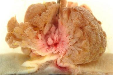 | Keywords: Villous adenoma of the sigmoid colon, gross pathology.jpg Another case of villous adenoma of the transverse colon this one more discrete and polyp-like than the case above Although it had a semi-decent stalk it was still far too large for safe removal by endoscopy so the surgeon was called in to do a segmental resection of the colon Prior to photographing the specimen was pinned out in formalin and fixed overnight The pink color in the center of the mass indicates that the formalin did not penetrate the whole lesion Shame on me for being chintzy with the formalin Note how the surface texture of the villous adenoma differs markedly from that of the surrounding colonic mucosa The photo above was shot with a Nikon D100 digital SLR with Sigma 50mm f/2 8 macro lens I stopped the diaphragm way down about f/22 to bring as much of this very three-dimensional lesion as possible into focus In Photoshop I resized the image for Web display sharpened the 'L' channel in Lab mode and used the Levels command to brighten it a bit Since many Web users now have flat-panel displays not as bright as CRTs and use their monitors in full room lighting I like to brighten up pictures more than I would for an image that was meant for projection in a properly darkened lecture hall Photography by Ed Uthman MD Public domain Posted 27 May 01; updated 20 Feb 05 http //web2 airmail net/uthman/specimens/index html PD Ed Uthman Gross pathology of neoplasms |