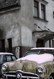 Keywords: vintage car oldtimer vehicles classic car classic car automobile motor automotive transport auto driving vehicle transportation drive snow cold winter windshield house building vintage