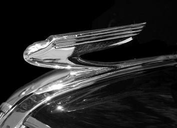 Keywords: vintage hood ornament antique design style artistic chrome nostalgia hood ornament retro car classic transportation automobile auto white restoration front metal vehicle shiny old-fashioned show ornamental transport outdoor usa america silver hobby collector black and white