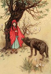Keywords: vintage old antique retro fairy tale stories story fairytale book illustration warwick goble illustrative scene scenic charming people girl red red riding hood fox woods forest plants outdoors nature