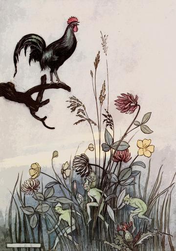 Keywords: vintage old antique retro fairy tale stories story fairytale book illustration warwick goble illustrative scene scenic charming cockerel chicken bird animal wildlife nature plants flowers garden fairies