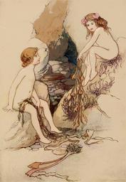 Keywords: vintage retro enchanted charming fairy tale enchanting book illustration warwick goble art illustrator fairytale old antique people kids children cave beach seaweed vacation