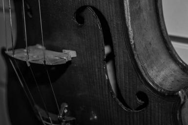 Keywords: violin music string instrument close up web strings f-hole old black white