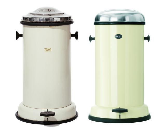 Keywords: Vipp.jpg A gauche la première poubelle Vipp A droite une poubelle Vipp actuelle modèle Vipp 15 de couleur crème Own Swtch Check categories 2010 June 23 fr wikipedia Vipp 1 Scandinavian design Waste containers
