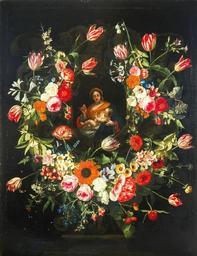 | Keywords: Virgin and Child in a Stone Niche Surrounded by Flowers by Gaspar Peeter Verbruggen I.jpg en The Virgin and Child in a Stone Niche Surrounded by Garlands of Flowers by Gaspar Peeter Verbruggen the elder oil on canvas 140 by 107 9 cm ; 55 1/8 by 42 1/2 in Sotheby's Gaspar Peeter Verbruggen the elder Gaspar Peeter Verbruggen I Garland of flowers frame in paintings PD-old-100 Images from Sotheby's | ||||