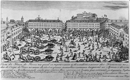 | Keywords: Vista da Praça do Rocio na qual se reprezenta a dezordem e terror dos Francezes no dia do Corpo de Deos no anno de 1808, os quaes tumultuozamente largarão as Armas e dezempararão a Artilheria pelo susto que o povo lhes cauzou.png en View of the Rossio Square in which is depicted the turmoil and terror of the French during the Feast of Corpus Christi on the year 1808 when they tumultuously dropped their Weapons and abandoned their Artillery due to the fight the People caused them and the rumours they heard the English have arrived pt Vista da Praça do Rocio na qual se reprezenta a dezordem e terror dos Francezes no dia do Corpo de Deos no anno de 1808 os quaes tumultuozamente largarão as Armas e dezempararão a Artilheria pelo susto que o povo lhes cauzou e os boatos que corrião já chegarão os Inglezes ~ 1808 http //arquivomunicipal2 cm-lisboa pt/X-arqWeb/SearchResultOnline aspx search _OB 3a 2b_QT 3aMFN_281080_Q 3a_EQ 3aT_D 3aT___ type PCD mode 0 page 0 res 1 simple 1 auth Je 2fvF9H7QyaGXKTczK4ZDHgI5WaOVfJlHb 2f2wDMkYWU 3d Arquivo Municipal de Lisboa author other versions Palácio da Inquisição Corpo de Deus 1808 com Junot na varanda principal png Castelo de São Jorge Corpo de Deus 1808 com a bandeira do Império Francês hasteada png Arco do Bandeira Corpo de Deus 1808 por onde foge a cavalaria Francesa png Custom license marker 2016 10 07 PD-old-100 1808 in Portugal Palácio dos Estaus Praça de D Pedro IV Exterior of Igreja de São Domingos Lisbon Arco do Bandeira Castelo de São Jorge in art Jean-Andoche Junot |