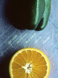 | Keywords: Vitamin C (1989 calendar march).jpg From an overhead angle white diagonal lettering on a purple background reads Eat More Fruits And Vegetables High In Vitamin C above the lettering is a green pepper below one half of an orange inside up Shot on 4x5 format This was used in the 1989 calendar Eat for Good Health March 1989 Topics/Categories Food and Drink Type Color Photo Source National Cancer Institute Bill Branson Photographer 2424 The Web site of the National Cancer Institute http //www cancer gov 1989-01 Reuse Restrictions None - This image is in the public domain and can be freely reused Please credit the source and/or author listed above Bill Branson Photographer PD-USGov-HHS-NIH Media from National Cancer Institute Visuals Online Images uploaded by Fæ Ascorbic acid |