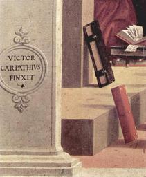 | Keywords: Vittore Carpaccio 063.jpg Artwork de Gemäldezyklus zur Legende des Hl Stephan Szene Streitgespräch des Hl Stephan Detail oil canvas de Mailand de Pinacoteca di Brera de Urspr Gemäldezyklus für eine venezianische Scuola The Yorck Project 10 000 Meisterwerke der Malerei DVD-ROM 2002 ISBN 3936122202 Distributed by DIRECTMEDIA Publishing GmbH 1514 Creator Vittore Carpaccio http //mail wikipedia org/pipermail/wikide-l/2005-April/012195 html Other versions PD-old-100 PD-Art-YorckProject Books in art Disputation of Saint Stephen by Carpaccio Signatures of painters from Italy Carpaccio Latin inscriptions in Milan Brera |