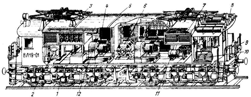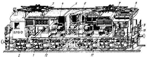 | Keywords: VL19-oborudovanie.jpg ru Расположение элект ообо удования на ВЛ19-01 1 - тележка; 2 - динамото ; 3 - пантог аф; 4 - элект опневматические контакто ы; 5 - съёмная часть к ыши; 6 - мото -гене ато ; 7 - пусковые езисто ы; 8 - главные езе вуа ы; 9 - межэлект овозные соединения; 10 - кабина машиниста; 11 - мото -комп ессо ; 12 - мото -вентилято Раков В А Элект овоз 1938г Author 1938 VL19 PD-Russia-2008 | ||||