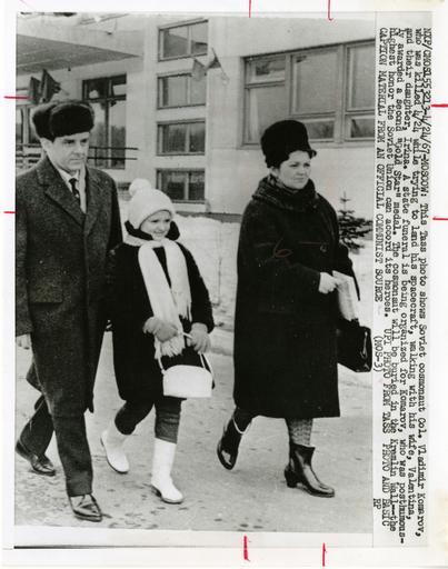 | Keywords: smithsonian institution smithsonianinstitution cosmonaut family man woman girl child space manned flight 1960s sixties smithsonian institution archives smithsonianinstitutionarchives women's history month womenshistorymonth women in science womeninscience 2011 20th century - mid 20thcenturymid astronomics government groupshot people blackandwhite black and white Creator: United Press International Subject: Komarov, Vladimir Mikhailovich 1927-1967        Komarov, Valentina Type: Black-and-White Prints Topic: Astronauts Local number: SIA Acc. 90-105 [SIA-SIA2008-4943] Summary: Soviet cosmonaut Vladimir Mikhaylovich Komarov (1927-1967) and his wife Valentina Komarov, and their daughter Irina, 1967. Komarov was killed while trying to land his spacecraft on April 24, 1967. Cite as: Acc. 90-105 - Science Service, Records, 1920s-1970s, Smithsonian Institution Archives Persistent URL:Link to data base record Repository:Smithsonian Institution Archives View more collections from the Smithsonian Institution. Creator: United Press International Subject: Komarov, Vladimir Mikhailovich 1927-1967 Komarov, Valentina Type: Black-and-White Prints Topic: Astronauts Local number: SIA Acc. 90-105 [SIA-SIA2008-4943] Summary: Soviet cosmonaut Vladimir Mikhaylovich Komarov (1927-1967) and his wife Valentina Komarov, and their daughter Irina, 1967. Komarov was killed while trying to land his spacecraft on April 24, 1967. Cite as: Acc. 90-105 - Science Service, Records, 1920s-1970s, Smithsonian Institution Archives Persistent URL:Link to data base record Repository:Smithsonian Institution Archives View more collections from the Smithsonian Institution. |
