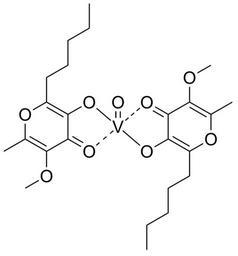 Keywords: VO(alx)2.svg Chemical structure of bis allixinato oxovanadium IV a vanadium complex with allixin Own 17 39 16 February 2011 UTC Ed Edgar181 Vanadium complexes Pyrones